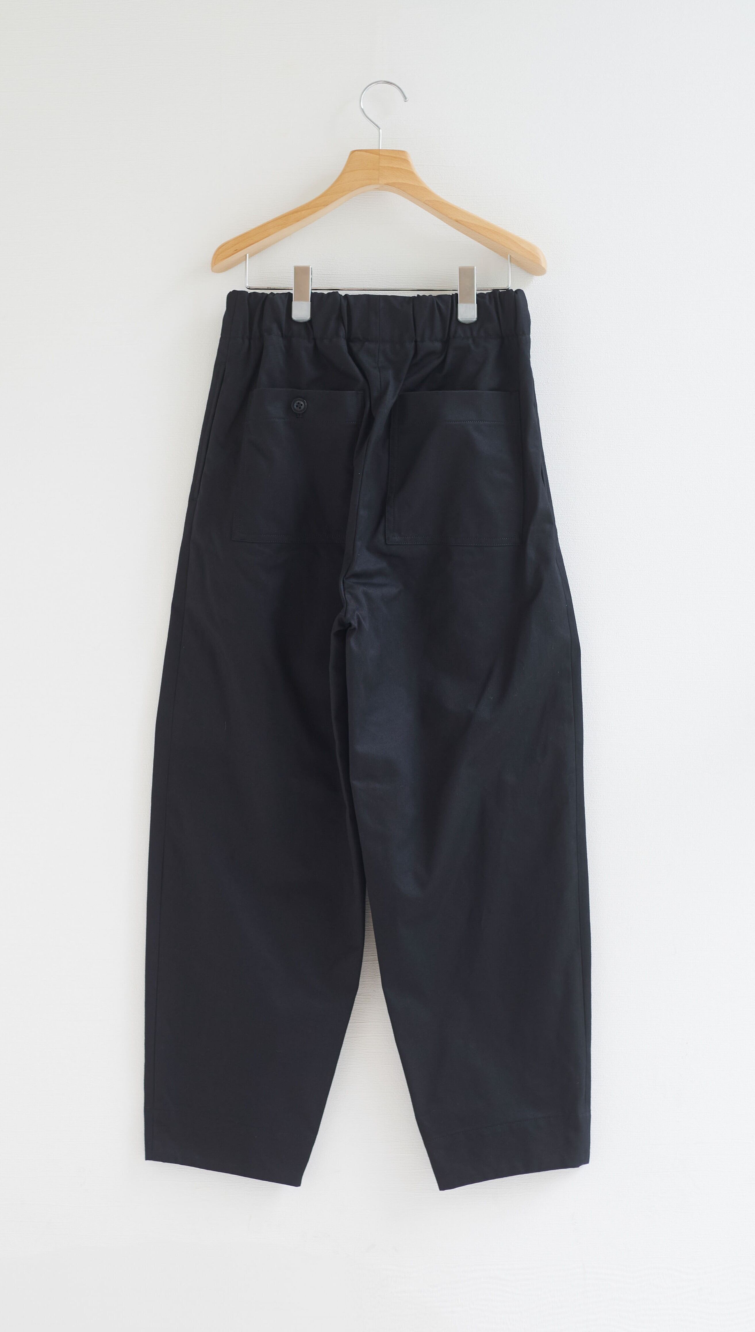 ウエストに平ゴムが入るイージーパンツ仕様となった、コットンのバレルレッグトラウザー。
