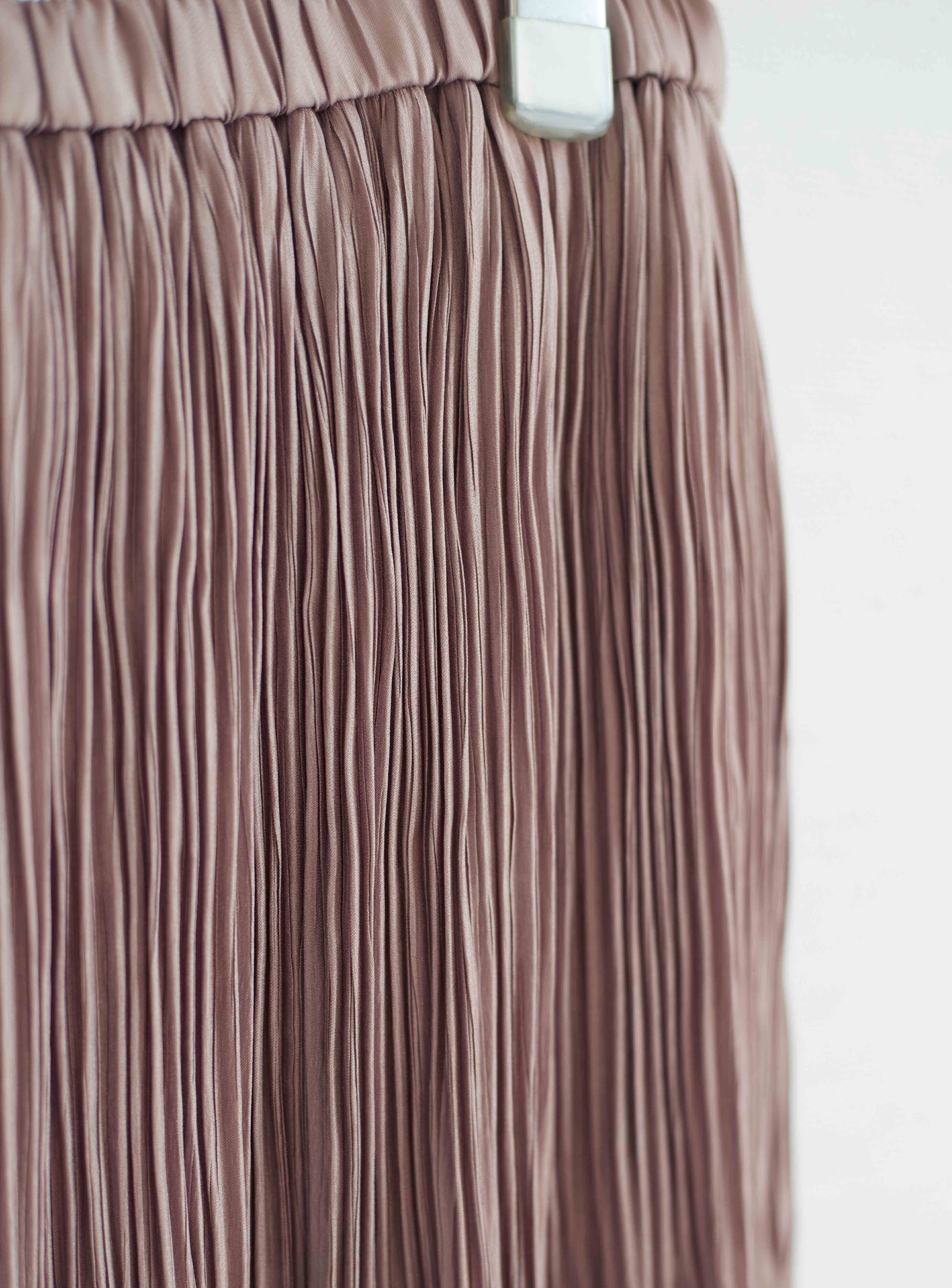 ウエスト下には細かなプリーツを配し、裾に向かってランダムな広幅プリーツへと切り替えることで、広がりすぎずすっきりとしたシルエットに。