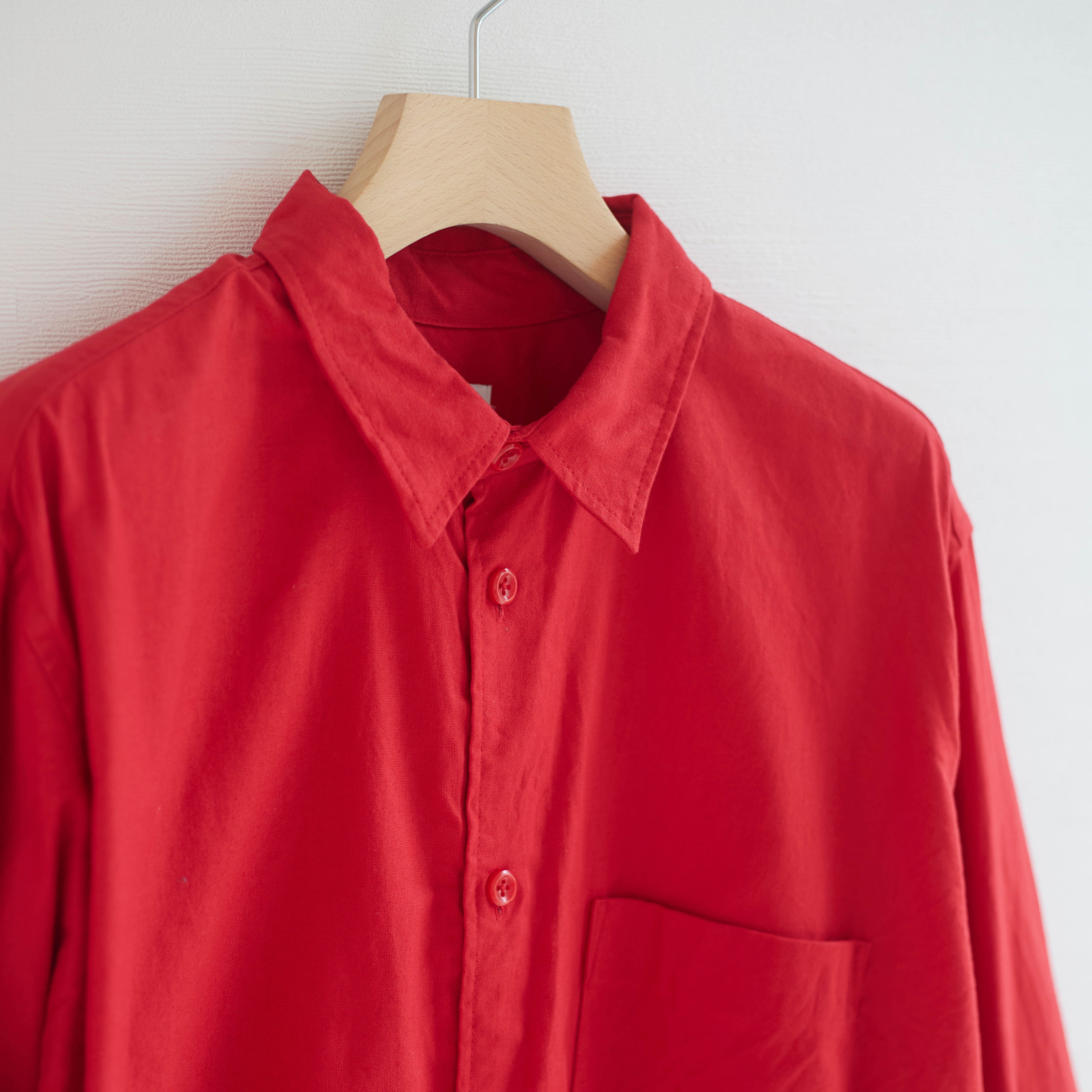 パッと目を引く鮮やかな赤長袖シャツ。