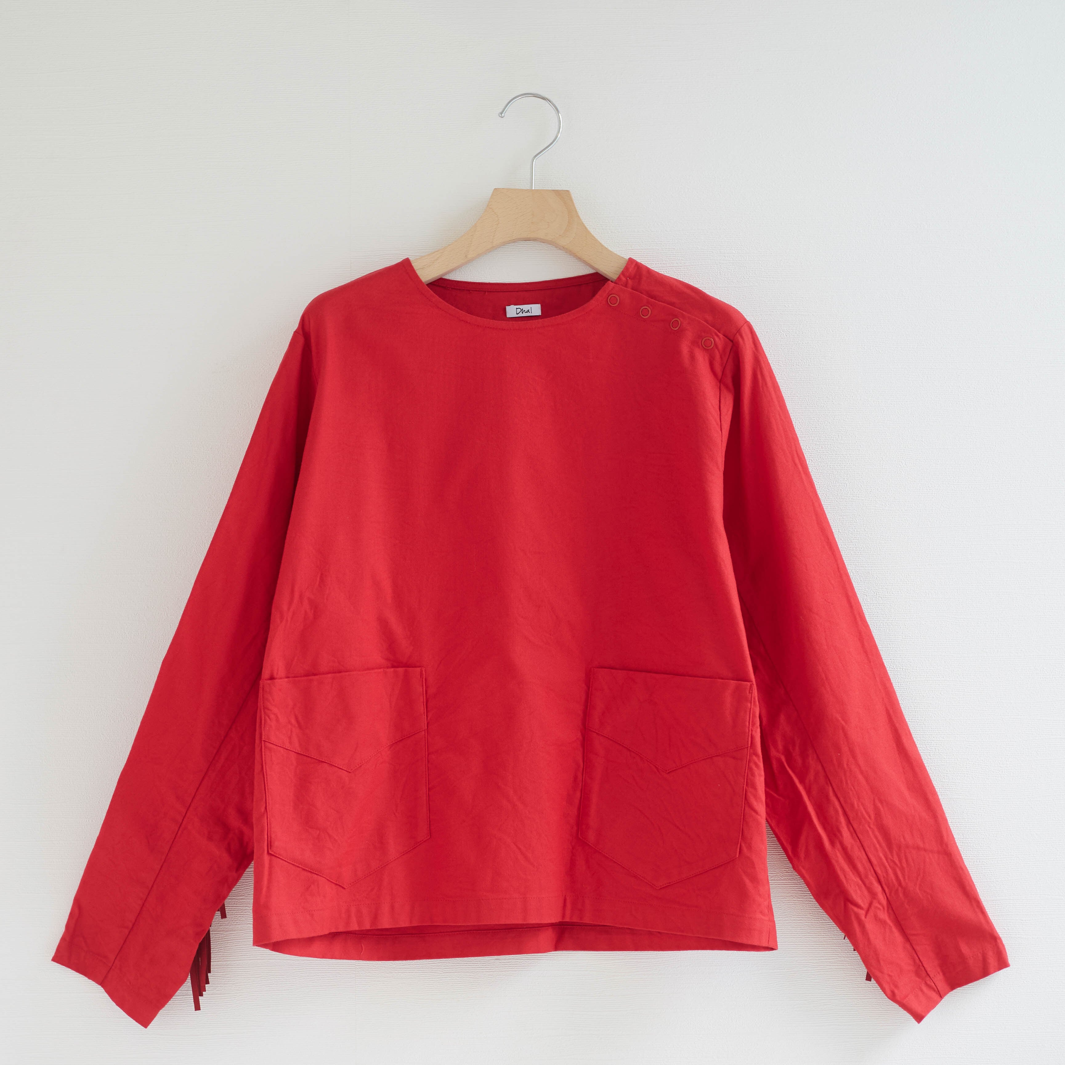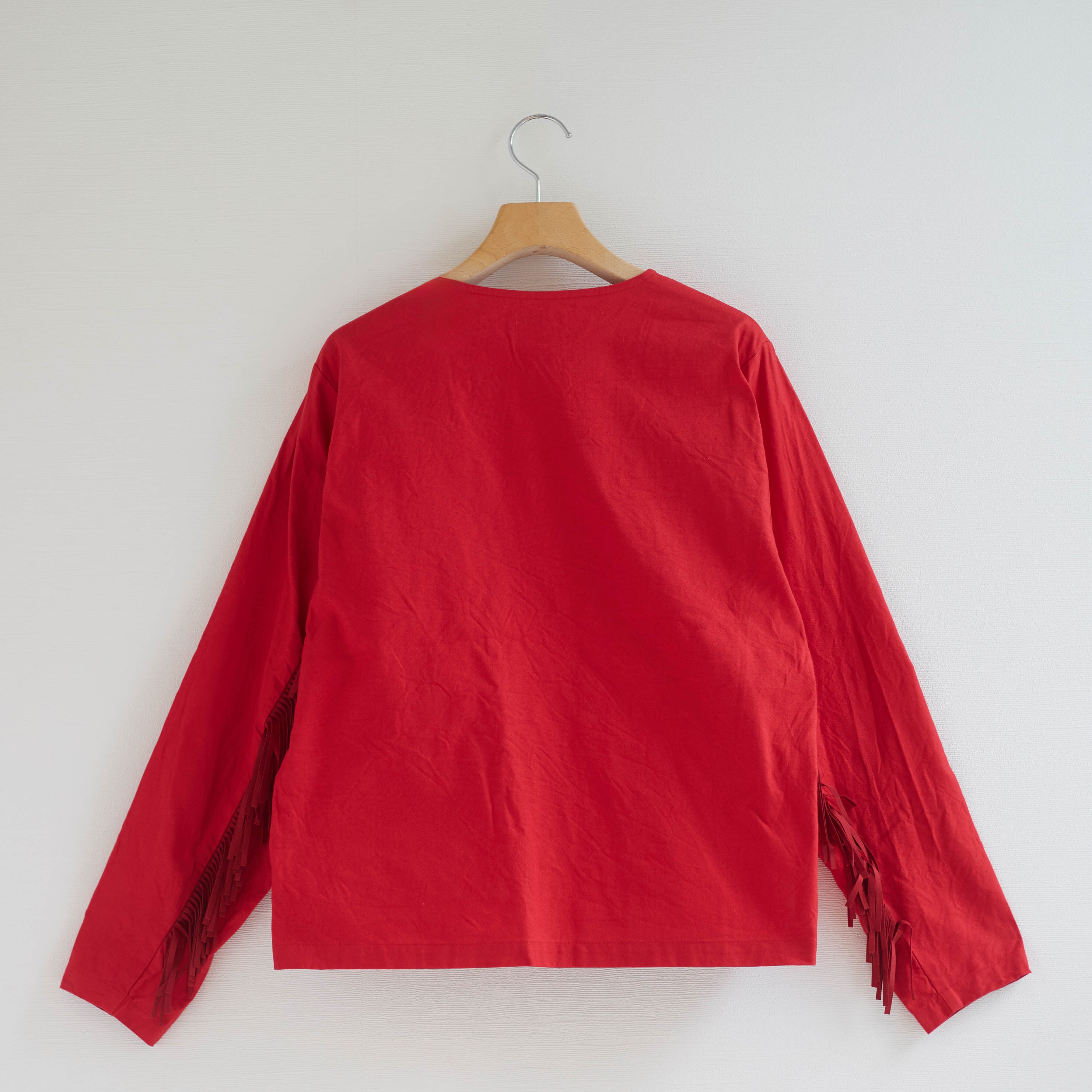 赤いボディにフリンジ、着るだけで目を引く一枚です。見るだけ十分に印象的ですが、実際に袖を通したときの着心地や生地の上質さに、きっと驚きを感じていただけると思います。
