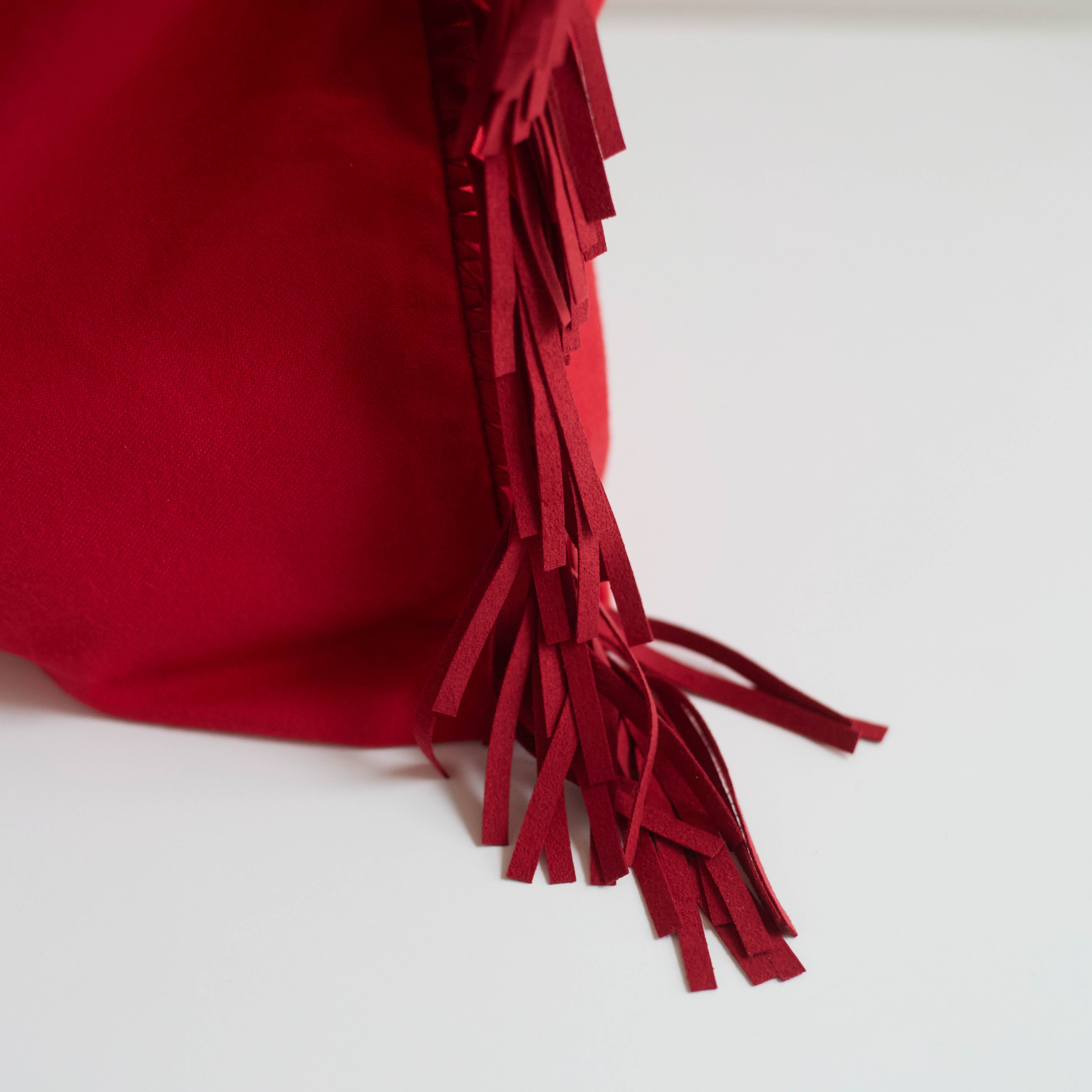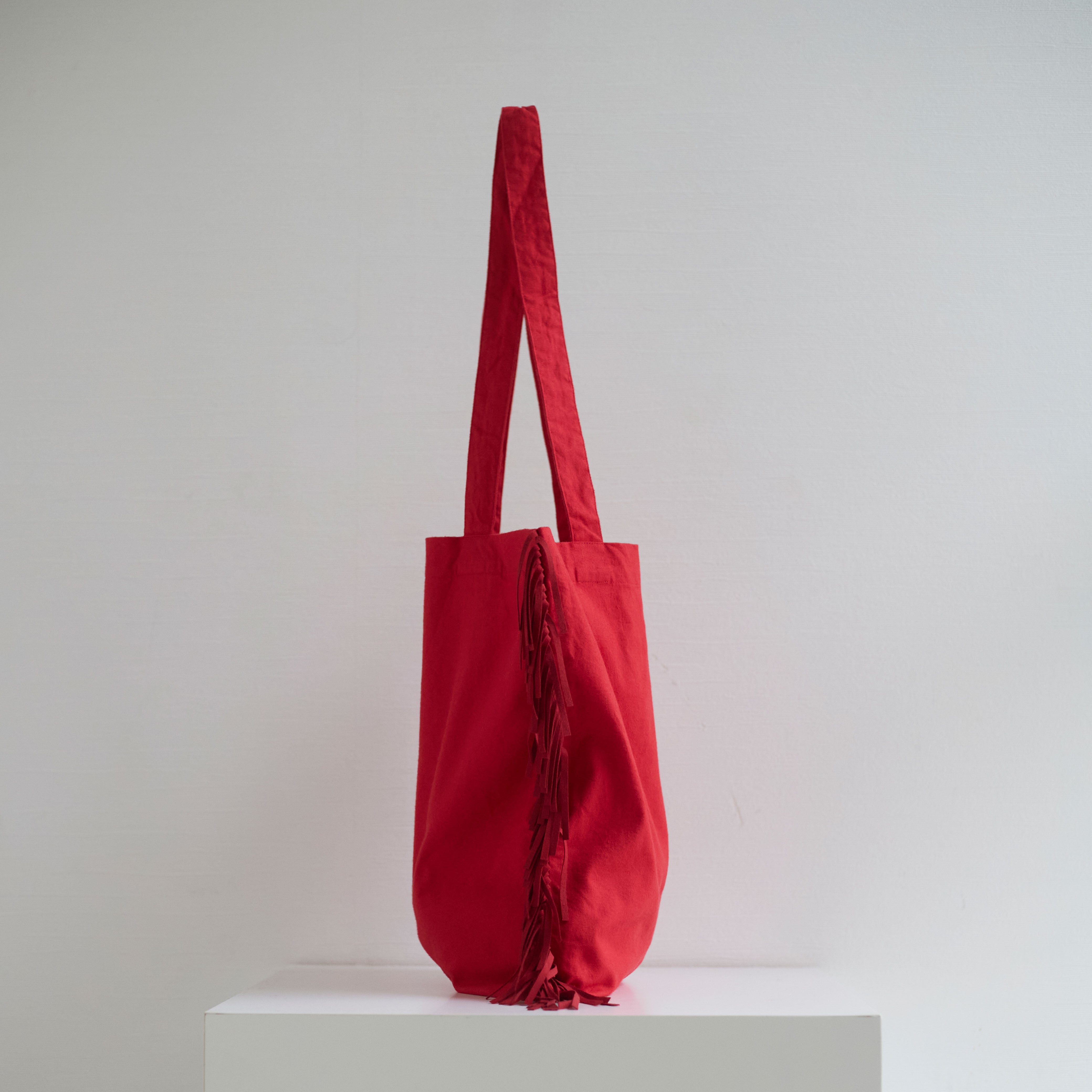 鮮やかな赤が目を引くフリンジトートバッグ。